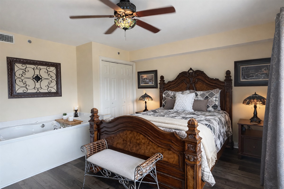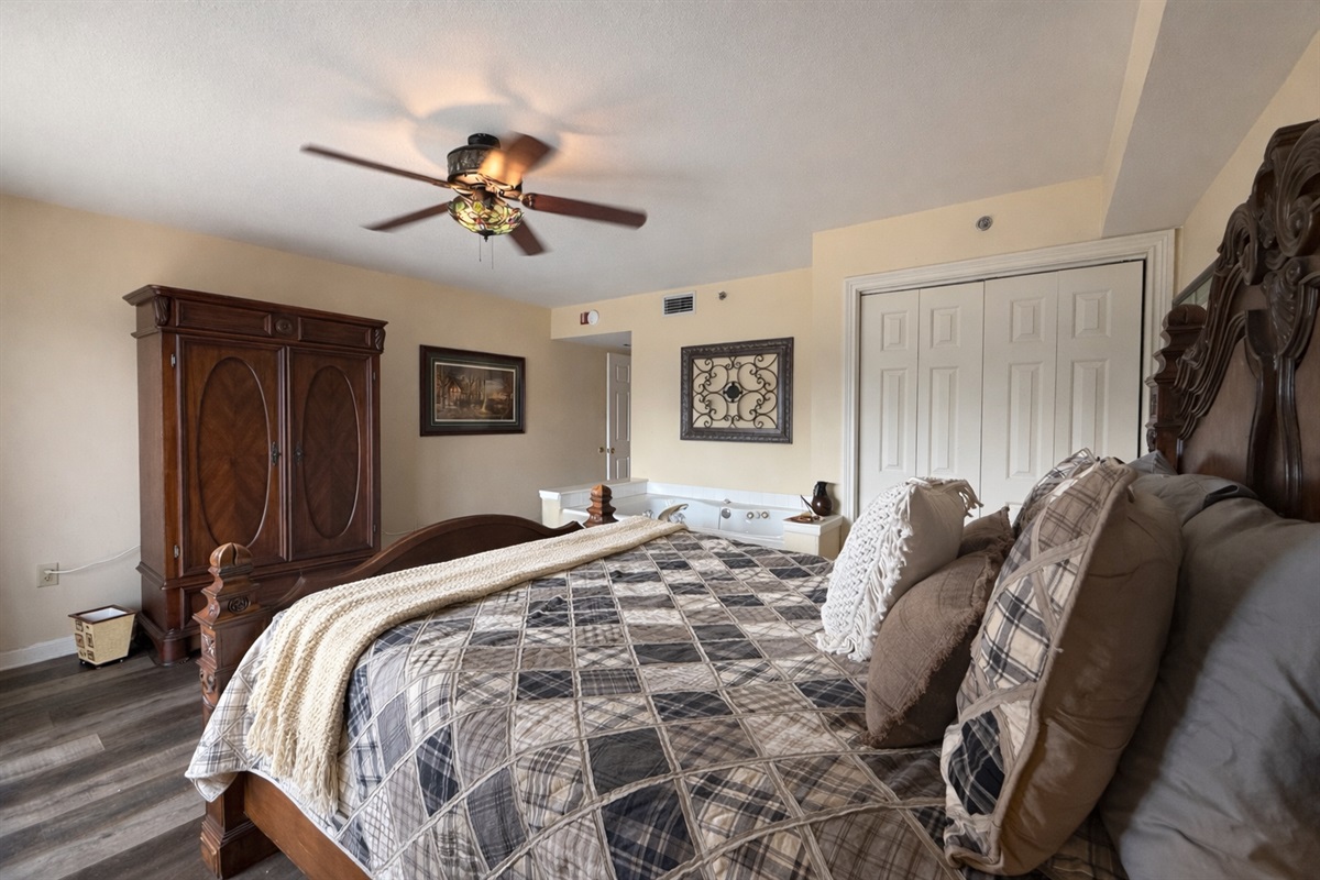 Our condo features a queen master bedroom with access to balcony and private in-room Jacuzzi. Private master bath includes large shower and double sinks. Master bedroom is equipped with flat screen cable TV and DVD player.